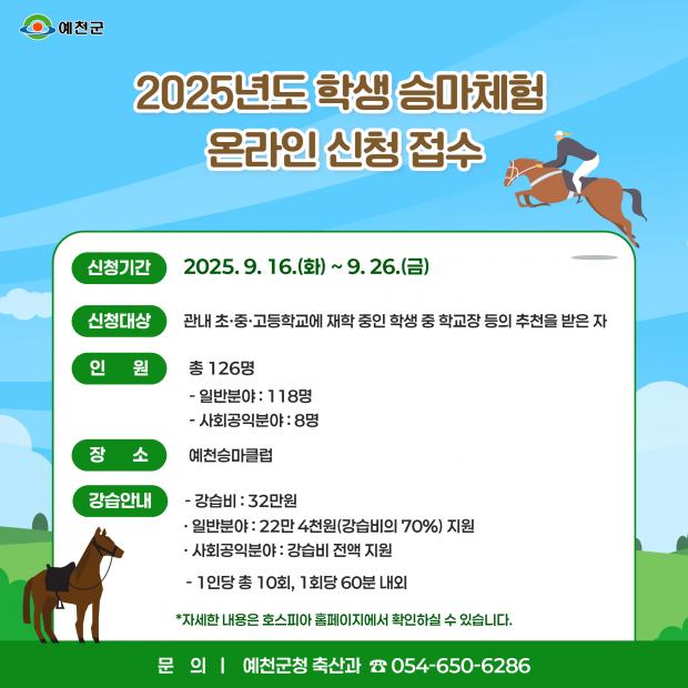 예천군(군수 김학동)은 2025년도 학생승마체험 신청을 말산업 정보포탈 ‘호스피아(www.horsepia.com)’에서 오는 9월 26일까지 접수한다.