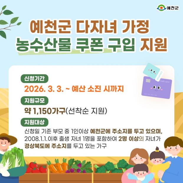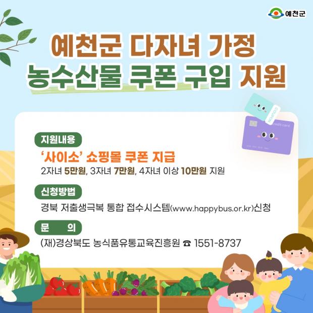 이와 함께 시행되는 농수산물 구입 지원 사업은 부모 중 1명 이상이 예천군에 주소지를 두고, 2008년 1월 1일 이후 출생 자녀 1명을 포함해 2명 이상의 자녀가 경북에 주소지를 둔 가구를 대상으로 한다.