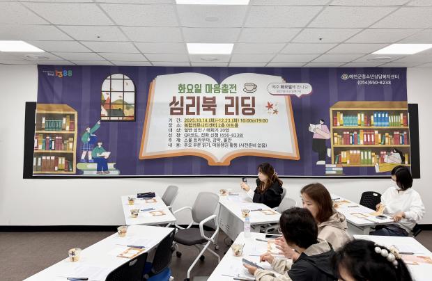 예천군(군수 김학동)은 ‘청소년안전망 Into 아웃리치’ 사업의 일환인 ‘화요일 마음충전 심리북리딩’ 프로그램을 지역 성인들을 대상으로 10월 14일부터 12월 16일까지 10주 동...