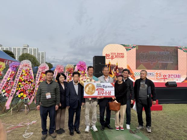 예천군(군수 김학동)은 21일, 영주시 문정둔치에서 열린 ‘2025년 경상북도 한우경진대회’에서 예천군 풍양면 김영휘 씨가 암송아지 부문 최우수상을 수상해 예천한우의 우수성을 널리 알렸다고 밝혔다.