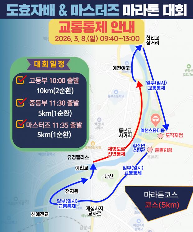 예천군(군수 김학동)은 오는 8일 오전 10시부터 예천읍 일원에서 「제12회 예천 도효자배 전국 중·고 단축마라톤대회」 및 「2026 예천군민 마스터즈 단축마라톤대회」를 개최한다고 밝혔다.